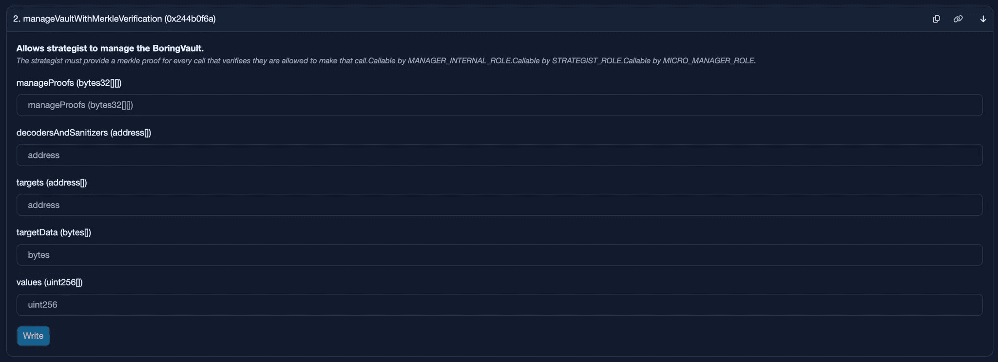 This value is used to verify transaction calldata every time a strategist manageVaultWithMerkleVerification function-call is triggered.